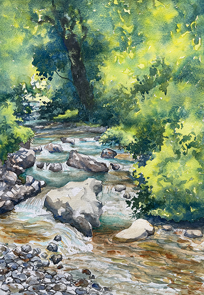 Mountain Stream (Watercolour, 00x00mm, framed, £160)