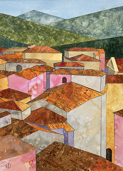 Rooftops of Barga, Tuscany (Watercolour collage, 370x270mm, framed, £175)