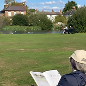 On what turned out to be the hottest day of the year so far, a small group of members gathered at the Molesey Lock Café for a morning of sketching and painting in the sunshine. Some bravely took on scenes in the full glare of the sun while others took advantage of the welcome shade offered by the café or trees along the riverside. Proximity to the river maybe meant the temperature was a degree or so lower but wherever we were it was an enjoyable morning and for some rewarded with a delicious ice-cream at the café.