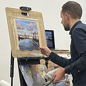 Rodney usually paints in oils 'en plein air' and is very familiar with the landscape around the River Thames but, of course, for the demo he had to work from a photo reference. He had prepared a canvas panel with a pale raw umber background and his first stage was to draw in a basic outline of the scene using dilute burnt umber and a fine brush. This was then enhanced with more intense colour to emphasize darker passages in the scene, adjusting the drawing constantly to get it right as a painting not just as a copy of the photo. Blocking in shapes of colour and tone then followed using a fairly limited palette (cadmium yellow, Naples yellow, yellow ochre, cadmium red, burnt umber, French ultramarine, cobalt blue and white). Rodney started with the darkest areas of the image and then gradually worked through the mid and light tones around the canvas. This process continued by focusing on smaller and smaller shapes within the image and the end result was an atmospheric interpretation of the original reference. A fascinating and informative evening to be followed by a workshop, also hosted by Rodney.