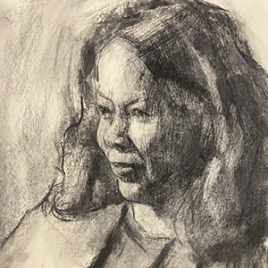 On a very cold November evening there was an excellent turn out for the debut appearance of Mick at MAS. Amanda Christie had kindly agreed to be the model for his demonstration creating a charcoal portrait from life. After a brief run-down of the materials he would be using Mick started in a distinctive way by applying charcoal dust to areas of shadow with a piece of sandpaper. In this way he creates texture on the paper surface and avoids committing to detail, building up the image in a generalised but considered way, all the time referring to the model to ensure that proportions and alignment of features are correct. Willow charcoal was then used to gradually pin down the features with constant adjustments, adding marks and just as importantly removing them with finger, putty rubber and soft paintbrush. By the end of the session there was a convincing likeness of Amanda rendered in Mick’s signature style and we had all been entertained and enlightened by his commentary throughout. The follow-up workshop should be enjoyable and challenging.